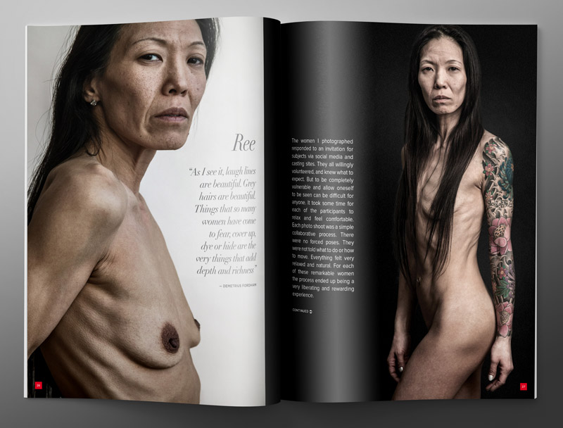 The women I photographed responded to an invitation for subjects via social media and casting sites. They all willingly volunteered, and knew what to expect. But to be completely vulnerable and allow oneself to be seen can be difficult for anyone. It took some time for each of the participants to relax and feel comfortable. Each photo shoot was a simple collaborative process. There were no forced poses. They were not told what to do or how to move. Everything felt very relaxed and natural. For each of these remarkable women the process ended up being a very liberating and rewarding experience.