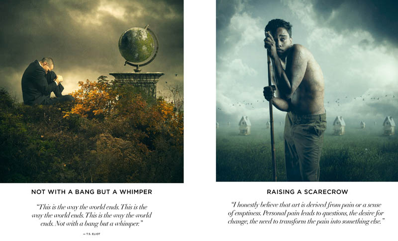 … the fears, the hopes, the personal and universal human condition expressed through metaphor and allegory. My images are surreal dreamscapes, conceived by piecing the individual photographic images together one at a time. They usually begin instinctively, with no concept in mind, until one is revealed through the process of improvisation, and the concept is then fleshed out further once it forms. The people, places and objects in the imagery are taken separately, and with these raw pieces, I assemble something that straddles both the personal and the symbolic surrealism, with something that is collective and focused.