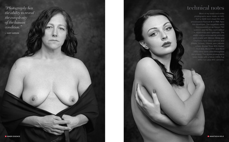 I have been making black and white film portraits since the late 1970’s. Ten years ago I decided to reach outside my comfort zone to explore nude portraits. The nude figure has been the subject of artistic interpretation for thousands of years in sculpture, paintings, drawings and more recently in photography by great talents such as Alfred Steiglitz, Edward Weston, Richard Avedon, Imogene Cunningham, Ruth Bernhardt and Jock Sturges, among many others. Over time, my approach and technique evolved. My project expanded to include approximately two hundred people.